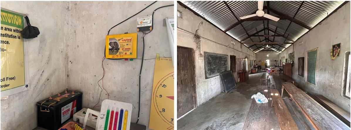 As we were discussing, the SMC Chairman pointed to the broken wall of a classroom, sharing their frightening yet strangely light-hearted encounters with elephants. They live in constant fear of being attacked. He told me that an elephant had headbutted the wall last May. The children had left some leftover food from the mid-day meal in the kitchen, and the elephant broke in to steal it. He added that earlier the elephants were scared of the electric fences, but now they run from afar and push through them to enter. The elephants have become more resilient, and the villagers are constantly trying to find new ways to scare them away.